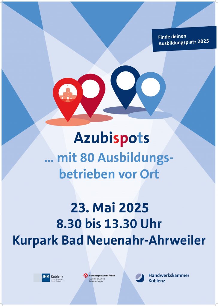 Du suchst eine Ausbildungsstelle? Ein Praktikum? oder möchtest einfach mal schauen, welche Ausbildungsberufe es so gibt. Bei den AzubiSpots stellen Unternehmen aus der Region sich und ihre Ausbildungsmöglichkeiten vor. Du kannst einfach mit ihnen ins Gespräch kommen und vielleicht sofort deine Ausbildung oder dein nächstes Praktikum klarmachen. Komm vorbei!